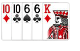 THREE OF KIND : Kombinasi kartu ini hampir sama dengan FOUR OF KIND, bedanya THREE OF KIND hanya membutuhkan 3 angka kartu yang sama. Misal : As♦ - As♥ - As ♠ - 8 ♣ - 10 ♣ atau 8 ♣ - 8♦ - 8♥ - 4 ♠ - 1♦